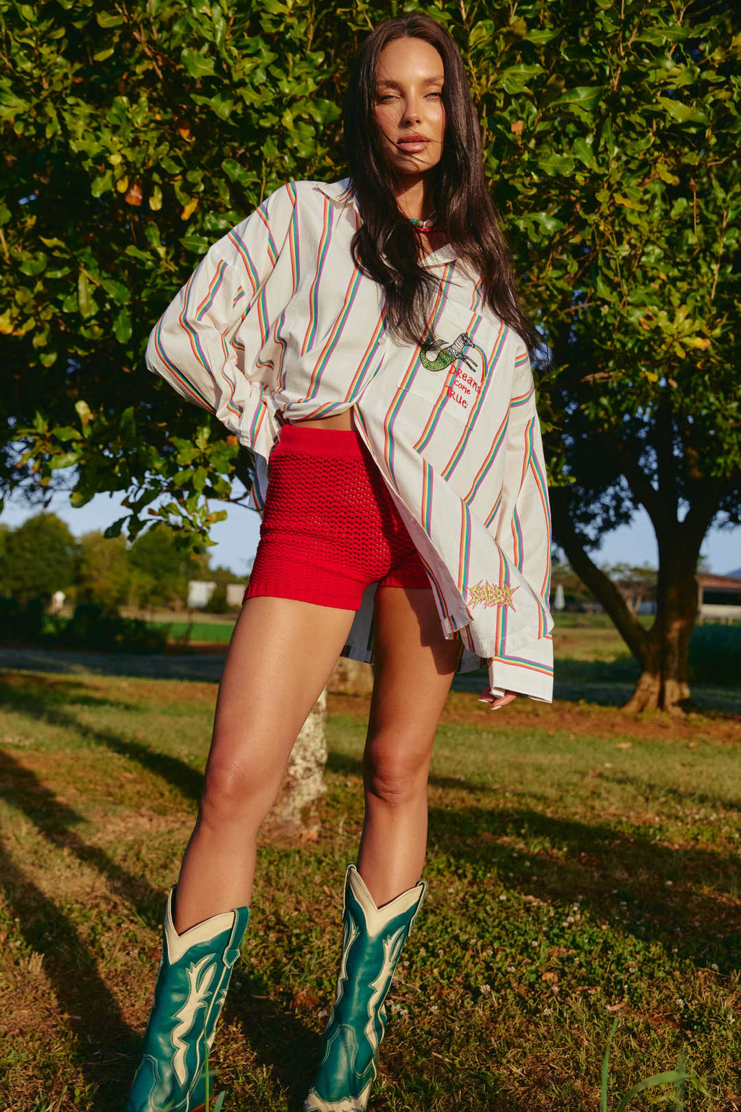 An oversized, mood-lifting button-up that turns every day into a good one. Splashed in juicy green and red stripes, it's a walking fiesta with a little dreams come true energy stitched right into the pocket.