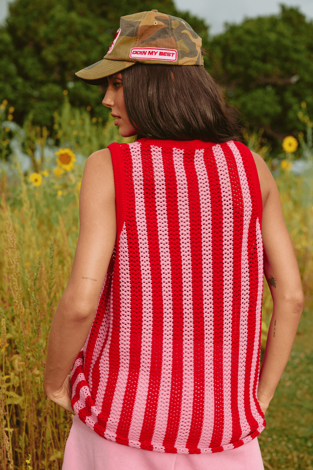 Meet The Knit B-Ball Singlet - the retro-sporty, festival-ready, sunshine-loving top that brings instant main-character energy. Boasting bold stripes, this breathable open-knit tank is the perfect mix of playful and nostalgic.
