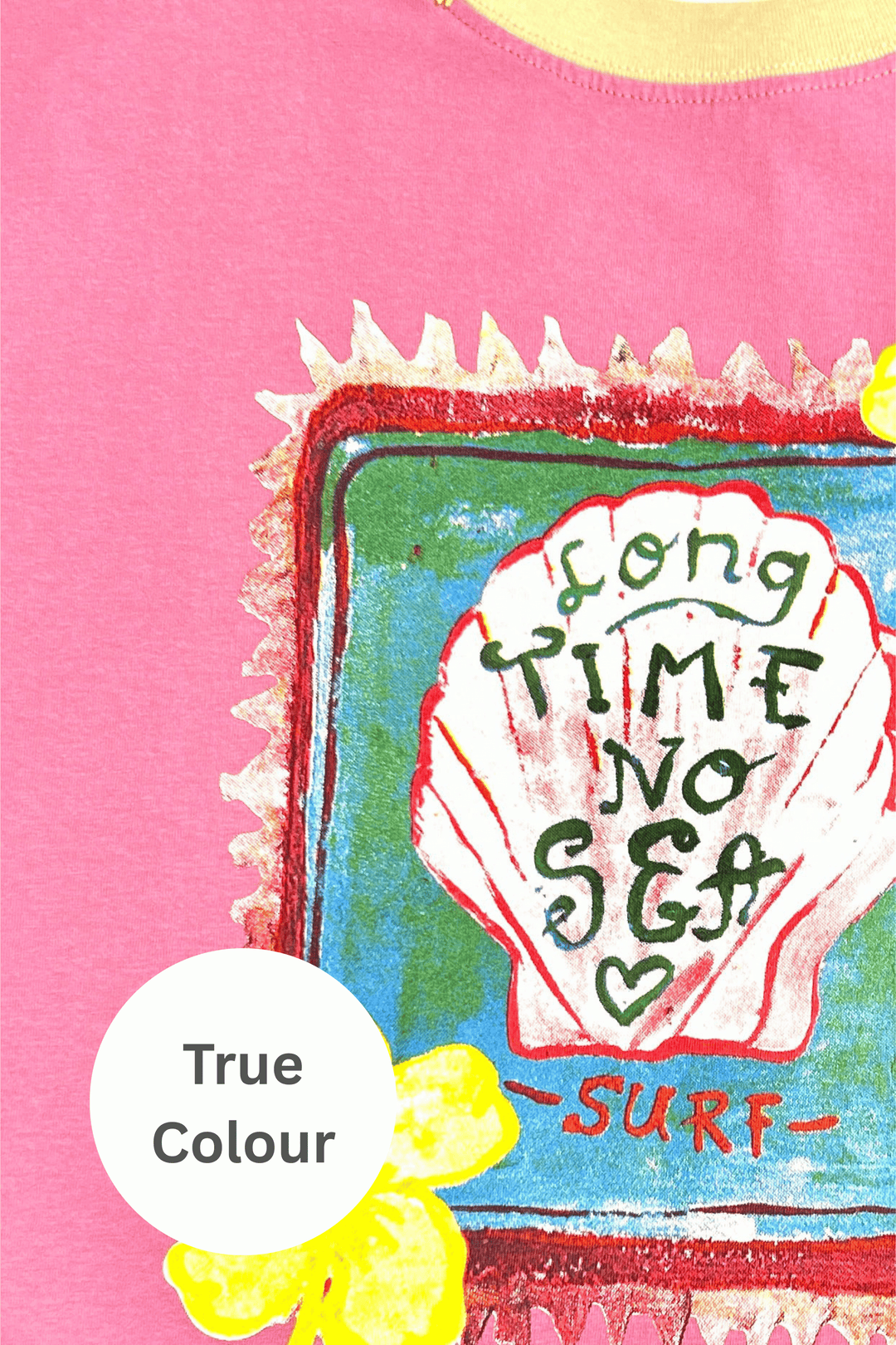 - Hand-drawn Long Time No Sea shell artwork on front
