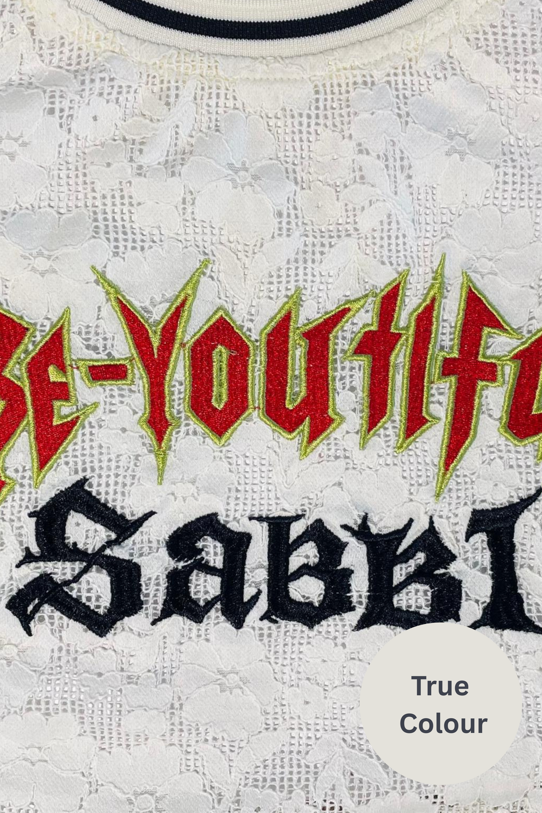 The Be Youtiful Cream Lace Singlet brings metal-band energy to the streets. Think retro rock vibes, electric Sabbi logo and sheer cream lace that teases just the right amount. Cropped to perfection with contrast trims, it's your go-to for gigs, late nights and all-day sass.